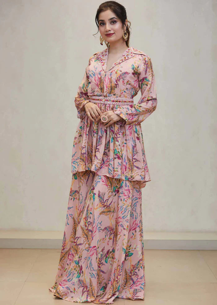 Command attention with our Peachish Pink Crepe Peplum Top! Adorned with resham and mirror work, it's paired with flare palazzo pants and a belt, perfect for a chic and stylish look.