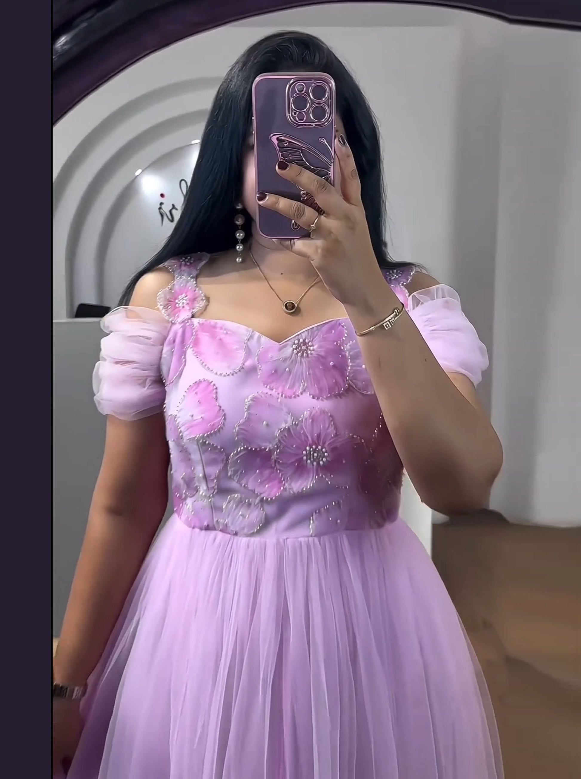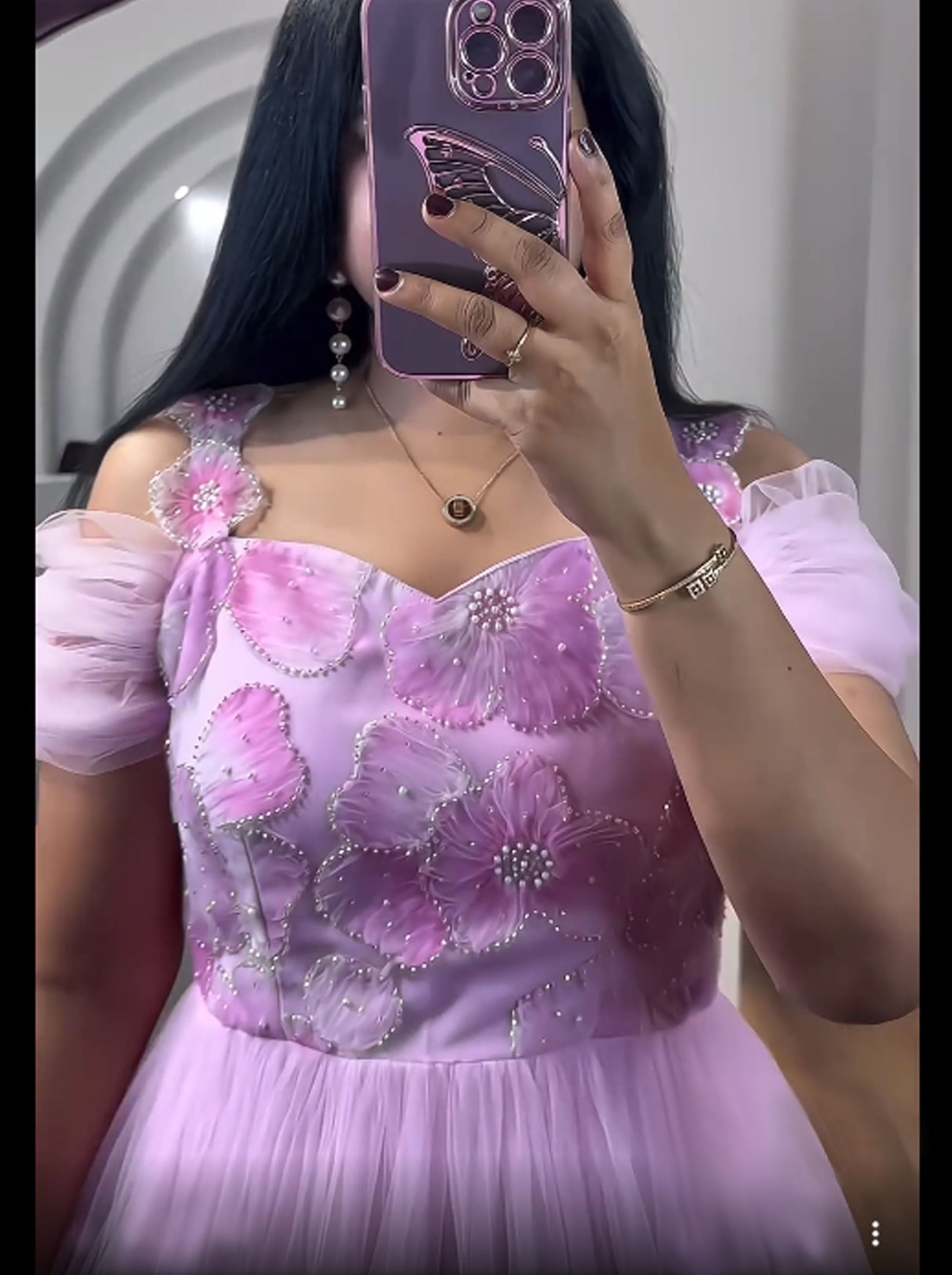 Top/Bodice:Off-shoulder design with puffed sheer sleeves, featuring floral embroidery adorned with intricate pearl motti handwork. |
